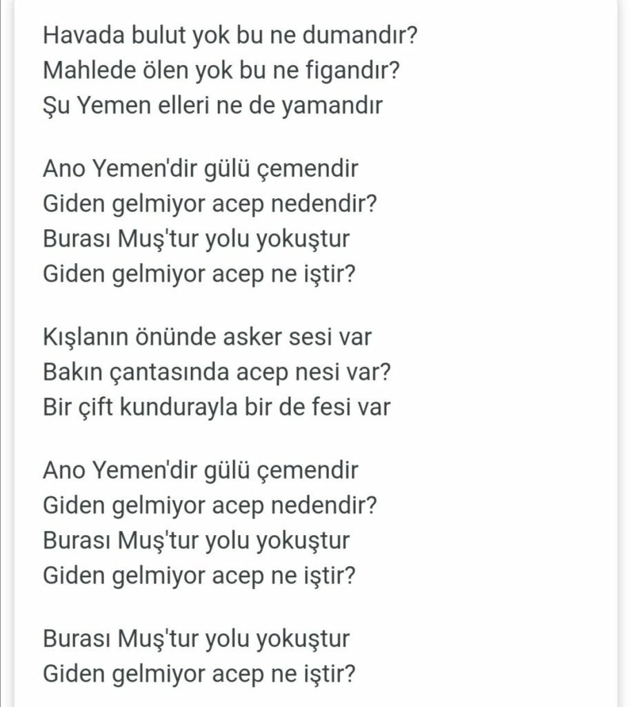 “Yemen çöllerine gitmeye hepimiz gönüllüyüz” Osmanlıya haber iletilir. Yetkililer bakar sayı yeterlidir. Yemen çöllerine Muş’tan oluşturulan bir redif alayı gönderilir. Yemen’e gidilmesine gidilir ama hiçbiri de geri dönmez. İşte Yemen türküsü gidip de gelemeyen o isimsiz kahramanların Muş’ta kalan özlemi, elemi ve acısıdır. Nişanlısının ölüm haberiyle yüreği yanan genç kızlar kale mahallesinden, yokuşun altındaki kışlaya bakarak bu ağıtı söylerlermiş.