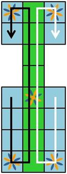Daha düşük ihtimalle de olsa oyuncuların orta bölümdeki dört kareyi geri alarak oyunu daha uzun hale getirdiği olası rotaMavi ile gösterilen “güvenli” alanlar ve yeşil renkte gösterilen “savaş” alanları ile oyuncuların taşlarını tahtadan çıkarmak için yarıştıkları en olası rotayı gösteren diyagram